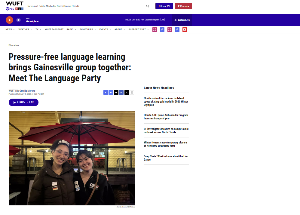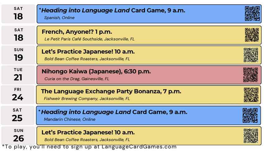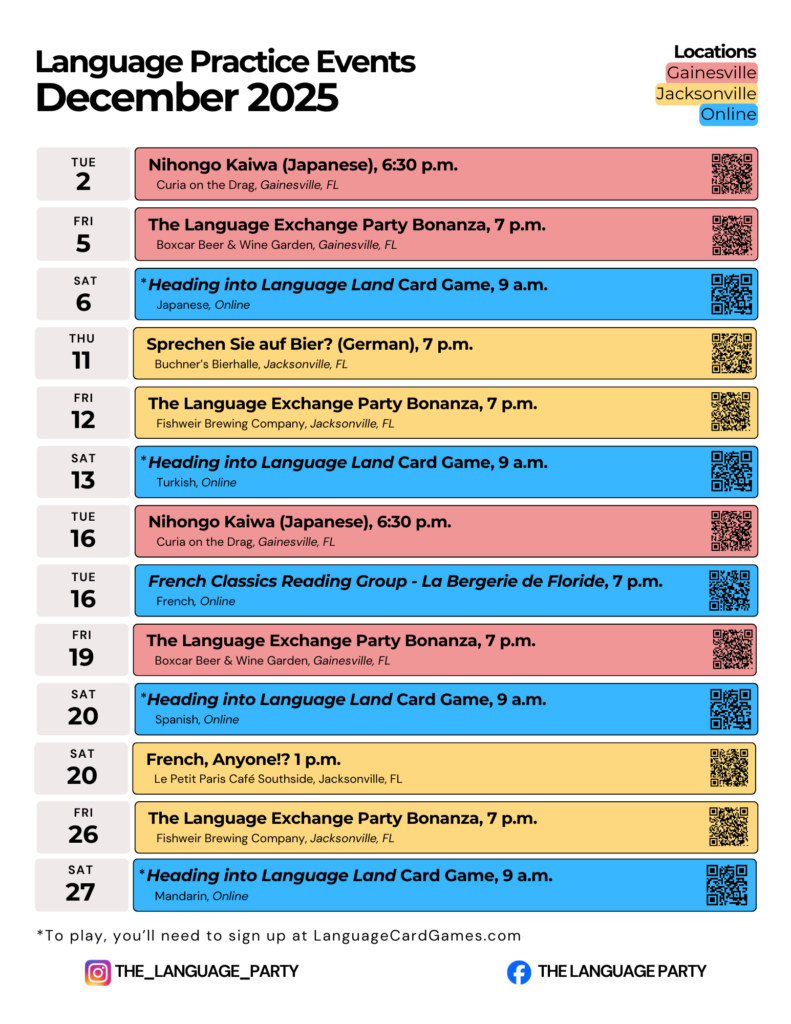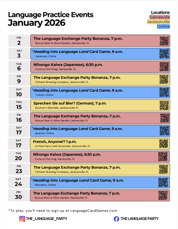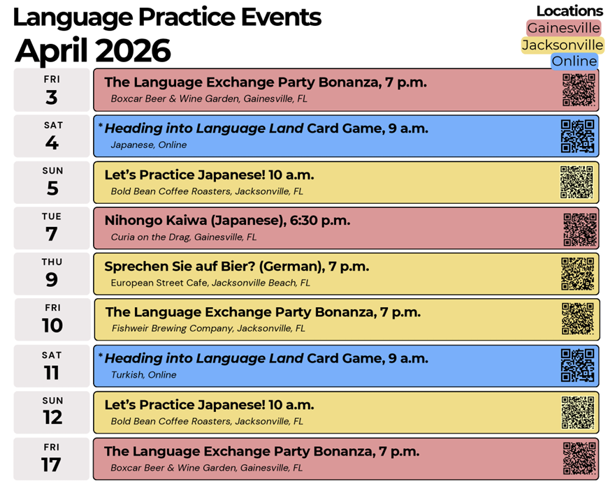 All languages are welcomed! Common languages participants practice at this event are English, Spanish, French, Japanese, Mandarin Chinese, Russian, German, Portuguese, Danish, Italian, Arabic, and many more languages.
