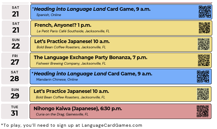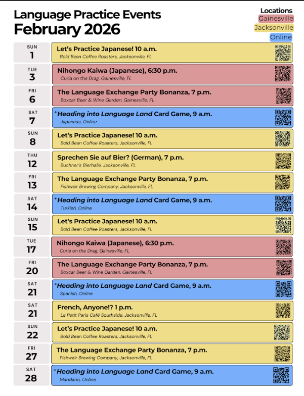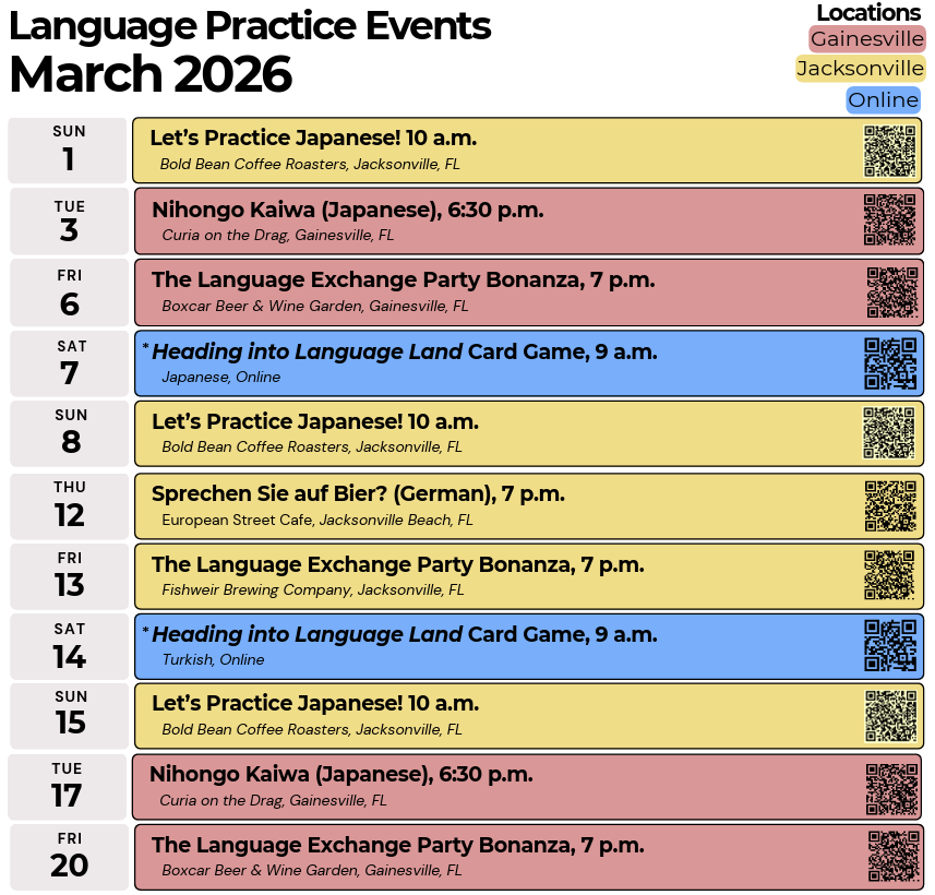 Upon entry to the venue everyone is given flag stickers of their choice based on the language(s) they are practicing and/or native language(s) they speak. These are put in order (usually on your shirt) from most fluent language at the top and least fluent at the bottom. This way people can easily identify other participants trying to practice a common target language. It’s a mixer where you find people that speak your target language to practice and language exchange. I’ll help you with your English if you help me with my Japanese…for example. Or I’ll help you with your Spanish if you help me with my French. That is the meaning of “Language Exchanging”. It’s a social gathering where you can make AMAZING friends from around the world. We also ocasionally play games for those who like to participate. You can come and participate for all 3 hours or just drop by for 30 minutes there are no obligations except to have fun. It is the perfect way to practice languages in a fun, safe, and very supportive environment! Come check it out!